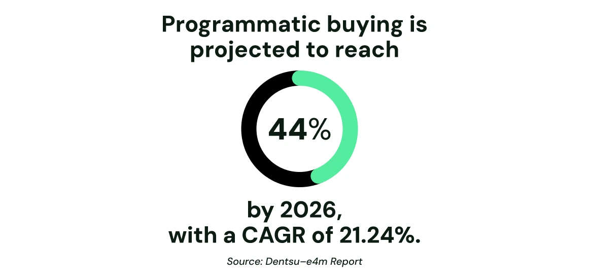 According to the Dentsu-e4m report, programmatic buying accounted for 42% of digital ad spend in 2024—a 21% increase over the previous year. This growth is set to continue, with programmatic expected to claim 44% of the market by 2026, growing at a CAGR of 21.24%.